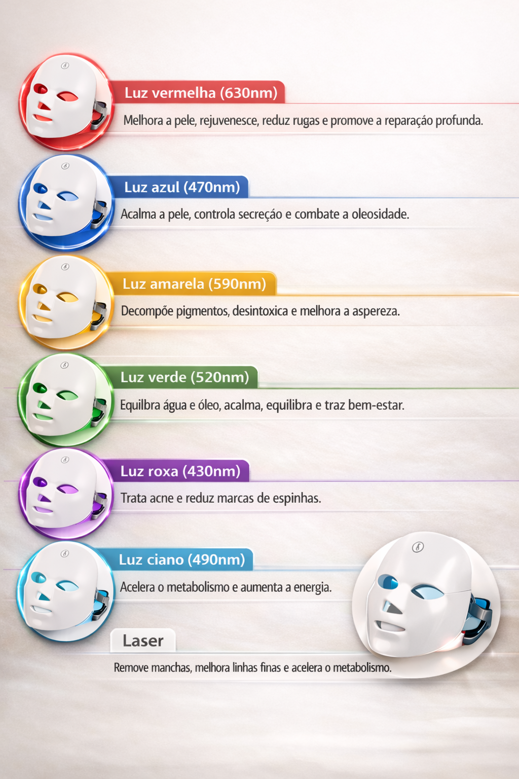 Cada cor da luz LED atua de forma específica para cuidar da sua pele: