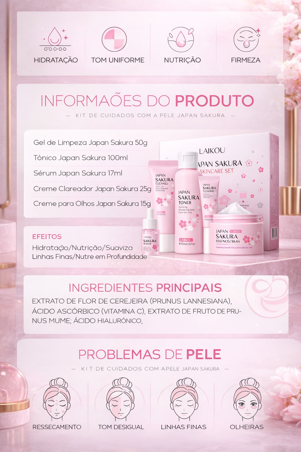 Transforme sua rotina de cuidados com o Laikou Sakura Kit e experimente uma pele mais hidratada, luminosa e rejuvenescida todos os dias!